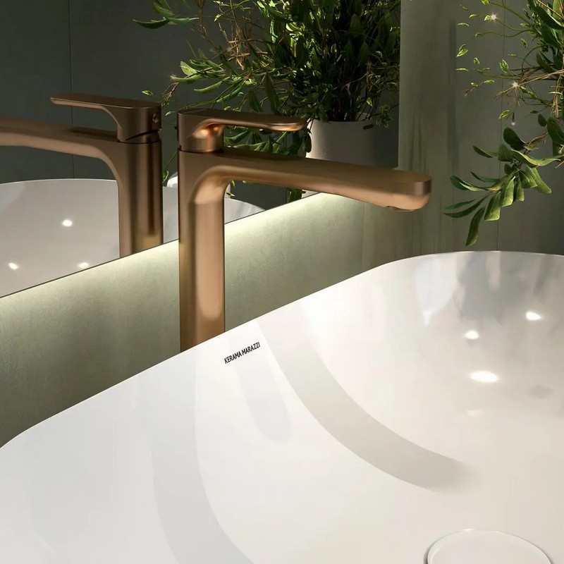 Высокий однорычажный смеситель OLE с обновлённым эргономичным дизайном представлен в трёх цветах (хром, чёрный матовый и золотой атласный). Модель устанавливается на столешницу, предназначена для использования с накладными раковинами KERAMA MARAZZI без отверстия под смеситель. Идеально cочетается со всеми артикулами серии OLE для душа и ванны.