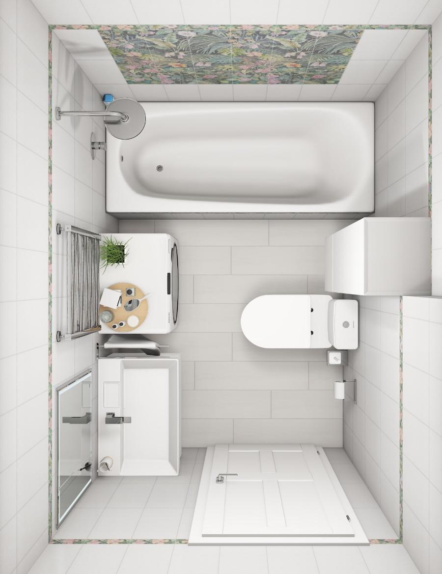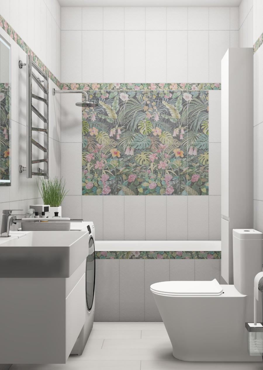 Основой проекта стала белая плитка с деликатной структурной поверхностью, визуально расширяющая пространство небольшого помещения. Центральным акцентом выступает декоративное панно с яркими цветами на черном фоне, создающее эффект "окна" в природный мир и добавляющее глубину интерьеру.