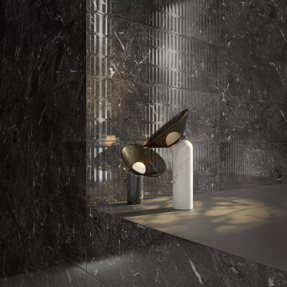 Коллекция включает альтернативный вариант – чёрный керамогранит, воспроизводящий структуру мрамора Infinity. Здесь прожилки светлого тона проходят по тёмному фону, создавая инверсию цветового решения относительно белого варианта. Контраст между основой и линиями в чёрном исполнении более выражен, что усиливает графичность рисунка. Оба варианта работают как самостоятельные решения или комбинируются в одном проекте, где светлый и тёмный тона создают зонирование пространства.