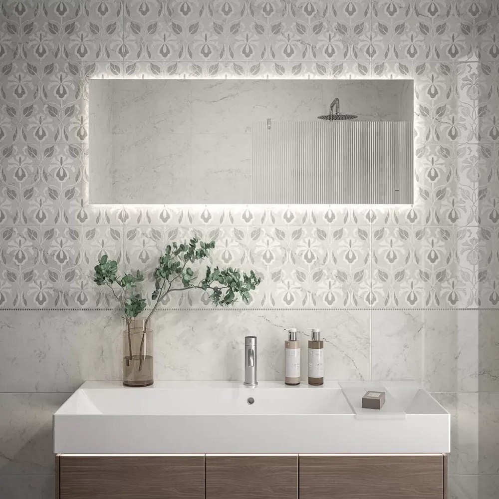 Белый мрамор Breccia Capraia характеризуется системой криволинейных прожилок, пересекающих светлую основу камня в различных направлениях. Эти линии формируют рисунок, напоминающий текучее движение, зафиксированное в твёрдом материале. Каждая плита натурального мрамора уникальна – прожилки не повторяются, создавая индивидуальный узор. Керамогранит «Тубкаль» из коллекции Morocco переносит эту графическую систему на керамическую основу, сохраняя визуальную сложность природного образца.