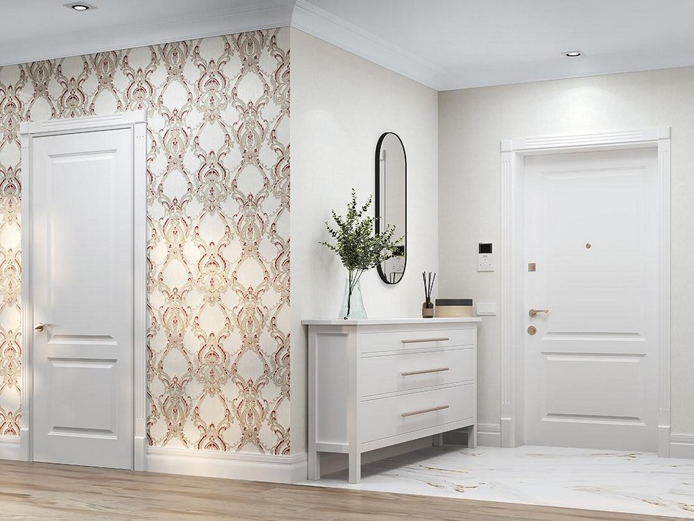Скандинавские интерьеры требуют сдержанности в декоре. Здесь дамасский орнамент применяется точечно – на одной акцентной стене в спальне или гостиной. Пастельная цветовая гамма обоев сохраняет светлую тональность, характерную для скандинавской эстетики, в то время как рельеф добавляет визуальный интерес без цветовой насыщенности. Остальное пространство остаётся нейтральным, позволяя орнаменту работать как единственный декоративный акцент.